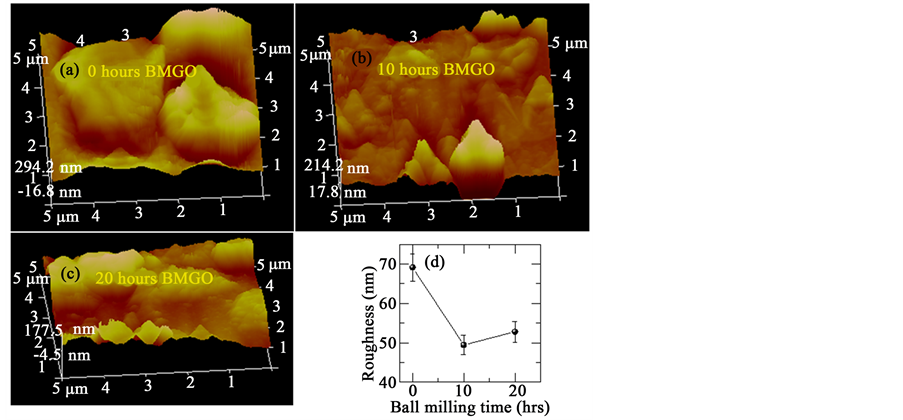 The morphological properties of the ball milled samples were performed using an atomic force microscopy (AFM) and are shown in Figures 3(a)-(c). Drop casting method is used to prepare thin films of ball milled samples. We strongly believe that there might be aggregation of GO flakes due to which the thickness of film is ~100 nm. From the figure, it is clear that surface roughness of film decreases and the variation is plotted in Figure 3(d).