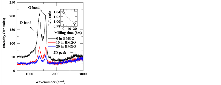 Figure 5. Raman spectrum of all BMGO (0 hr, 10 hr and 20 hr) samples. Inset shows the variation of ID/IG ratio of BMGO samples with ball milling time.