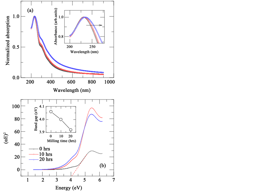Figure 7(a) shows the normalized absorbance vs. wavelength spectrum for all the ball milled GO samples. It is evident that the maximum absorption peak prevails around 230 nm due to π-π* transition of the aromatic carbon-carbon (C=C) bonds and shoulder peak nearly at 301 nm obtained due to n-π* transitions of epoxide (C-O-C) bonds [24] [25] . It is also evident from inset of the figure that peak position shifts to higher wavelengths, hinting a reduction in band gap upon milling time. The relation between incident photon energy and absorption coefficient can be defined as