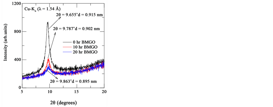 where K is the shape factor, λ is the wavelength of the CuKα radiation, β is full width half maximum and θ is Bragg’s angle; and is found to be 9.51 nm and 8.43 nm for 10 hr BMGO and 20 hr BMGO respectively (Figure 2(b)). This may be one of the reasons why the intensity of XRD peak at 9.655˚ decreases.