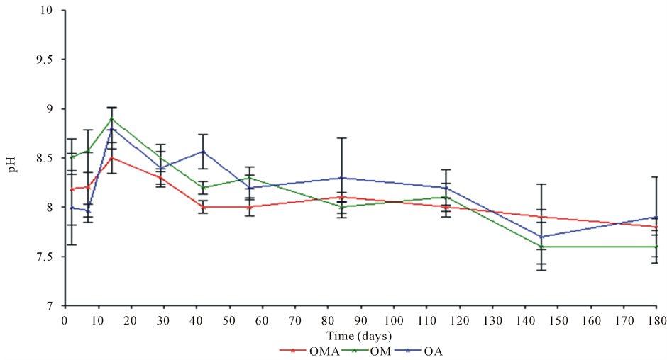 Figure 5. pH variation in the three different mixtures during the composting: OMA, onion-manure-alfalfa; OM, onion- manure; OA, onion-alfalfa. Vertical lines represent the standard error.