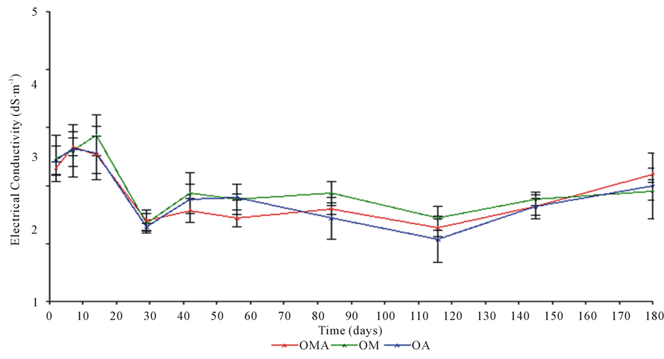 At the end of the process, registered values were: 2.2 dS∙m−1 (OMA), 1.9 dS∙m−1 (OE) y 2 dS∙m−1 (OA). Similar results were obtained by [33] and [34] .