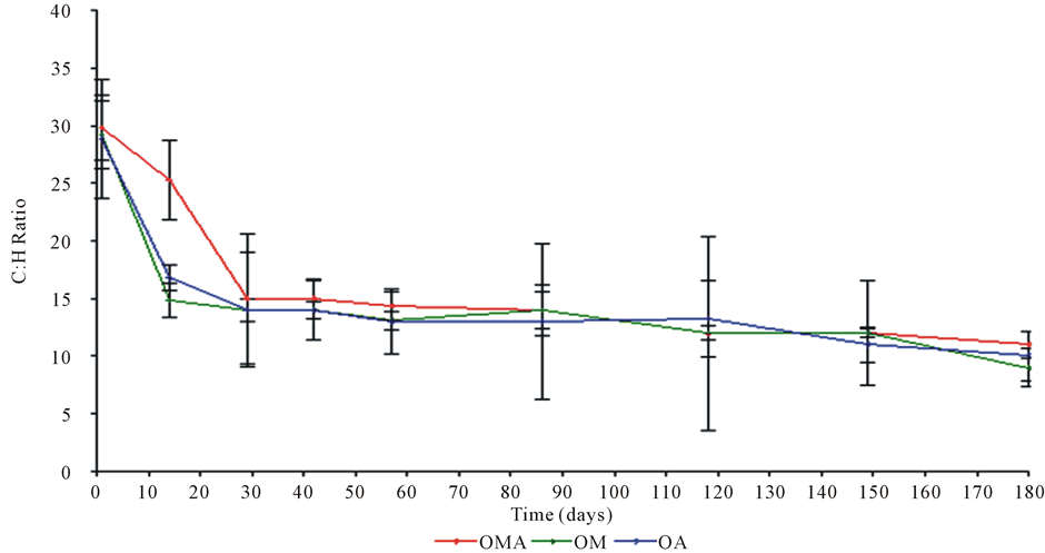 Figure 7. Evolution of the C:N ratio in the three different mixtures during composting: OMA, onion-manure-alfalfa; OM, onion-manure; OA, onion-alfalfa. Vertical lines represent the standard error.