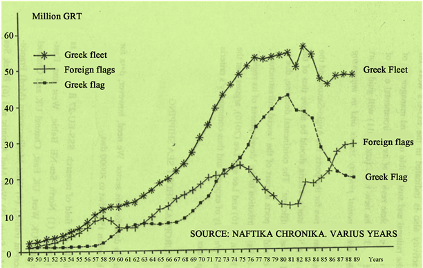 When socialists came to power (Oct. 1981) Greek flag retreated to almost 1/2 of its power, i.e. from 43 m GRT (1981) to 20 m (1989) (Figure 1); this was a