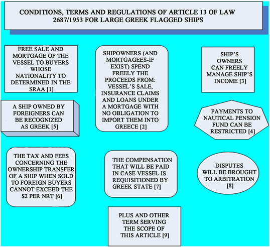 The super term, however, was number 9 (Figure 2), establishing the flexibility and the adaptability of the total legal framework over time; surely, this is based on the initiative of shipowners on the one hand, and the state to approve his/her requests, on the other. Term 9 establishes also the ability of the administration to include and any other term serving the purpose of article 13, beyond the 9 ones mentioned indicatively. This term 9 we consider to be a genius contribution of law 2687, article 13, to shipping.