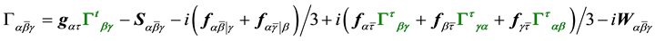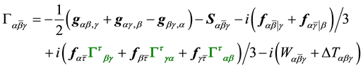 We added and subtracted ΔTαβγ in (3.28a) and then rewrote the result in a more convenient form in Equation (3.28b) where we absorb the ΔT into the W field as we planned above and wrote the first term explicitly the lowered classical Christoffel symbol. The resulting W field is now bolded since it will be a real covariant field just like g, f and S. Equations (3.29a) and (3.29b) simplify the result even more by combining the first two terms using the complex metric tensor.
