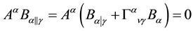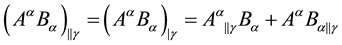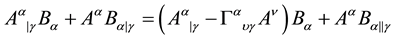 We note that the Christoffel symbols for the lowered indices can be derived from Equations (3.3a)-(d) using ϕ = AνAν and Equation (3.1) for the covariant derivative of a scalar function―just as is frequently done in classical Riemannian geometry. The process is summarized in Equations (3.3a)-(3.3c). In Equation (3.3a) the scalar function AαBα is differentiated first as a scalar function as then as a tensor product. By expanding out the covariant derivatives in Equation (3.3b) and then reorganizing terms in Equation (3.3c), we get an equation for arbitrary tensor fields Aα and Bα. Since Aα is arbitrary, the other factor must be zero, and can be rewritten as Equation (3.4a). Similar logic leads to Equations (3.4b)-(3.4d).