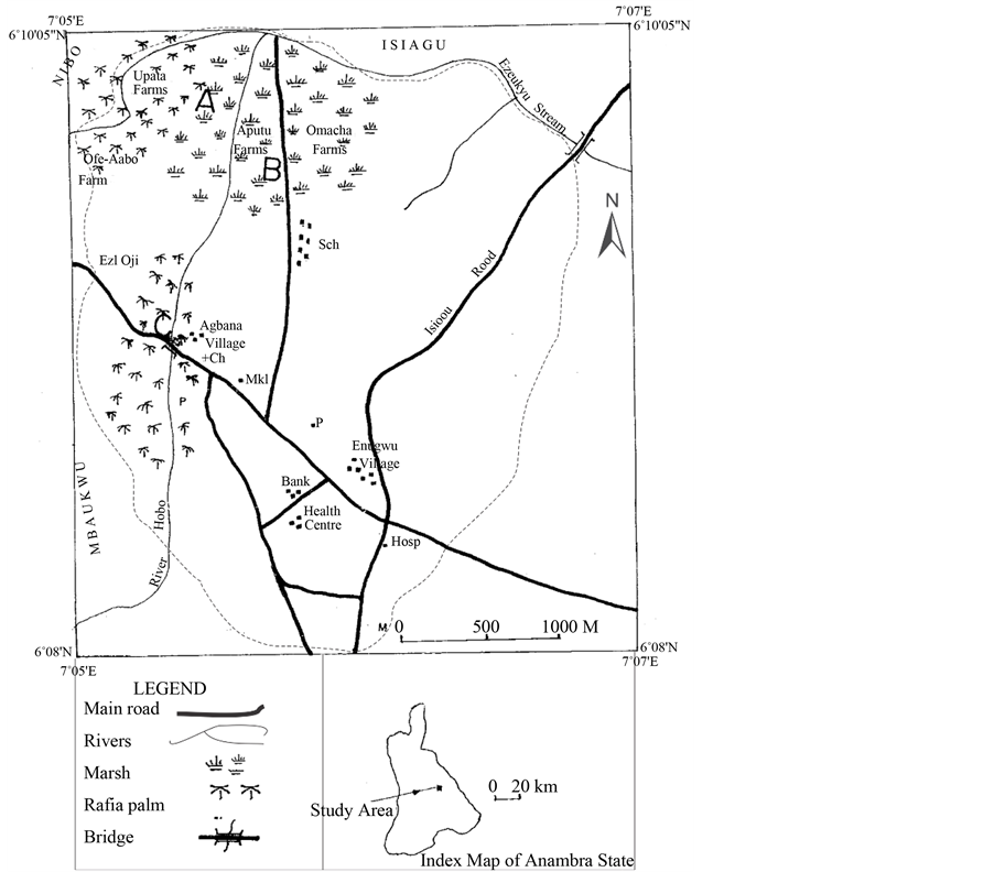 Apiti wetland is situated in Umuawulu, Awka South Local Government Area of Anambra State within the Mamuriver basin. Located between latitudes 6˚08'N and 6˚10'N and longitudes 7˚05'E and 7˚07'E (Figure 1), the area is made of undulating plains found on Awka-Orluuplands east of Awka town. Vegetation is the derived savanna, characterized by the existence of interposing short trees in a grassland environment, and drained by two streams namely, Haba and Ezekwu. Geologically, the entire area is composed of marine shale deposit called Imo shale which was one of the tertiary era sediments deposited at paleocene stage. It has some sandy faces called Ebenebe sandstone and has a maximum thickness of 500 mm which is made up of clayey shale that is always either dark red or bluish in colour. It also contains clay ironstones which manifests in some areas as limestone concretions [11] . Mean annual rainfall of the study is about 1800 mm while relative humidity in the wet season is about 80%, but can go as low as 40% during the dry season especially in the hamattan period.