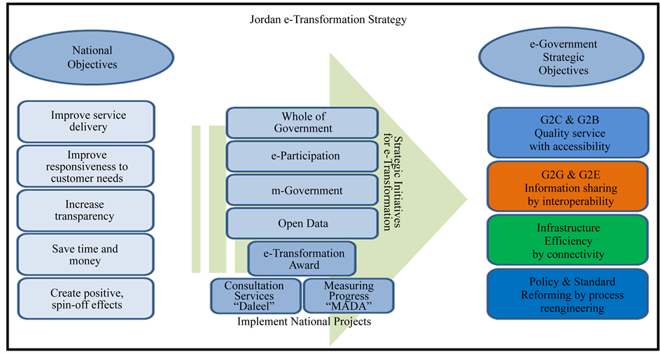Jordanian government is offering multiple business and technical services to support interaction between government entities and their customers through E-government. Government program in Jordan was launched by his Majesty King Abdullah II to achieve greater efficiency in government performance by raising the level of service delivery to clients and investors from all segments of society easily, quickly, accurately and efficiently and to become a new type of performance of government employees and government transactions [12] . E-govern- ment in Jordan is dedicated to delivering services to people across society, irrespective of location, economic status, education or ICT ability.