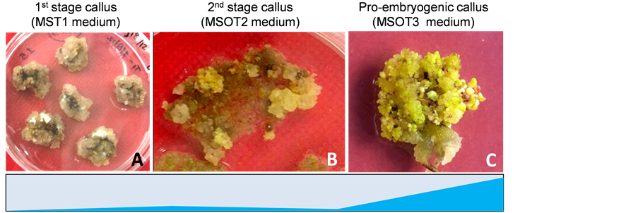 Figure 4. Regeneration of cotton (Gossypium hirsutum L. cv. Coker 310) through somatic embryogenesis [65] . (A) Cotyledonary explants with yellowish-friable callus; (B) Yellowish-white granular embryogenic callus after second sub-culture; (C) Embryogenic callus after 15 days of incubation. Relative quantification of GhSERK transcripts in the corresponding stages of regeneration is shown. Normalized values are plotted from different tissues analysed including three stages of callus formation. Significant expression up-regulation of GhSERK1 observed in the embryogenic calli on MSOT3 medium is illustrated with shaded area.