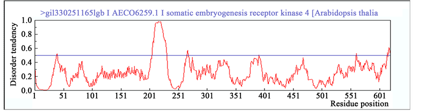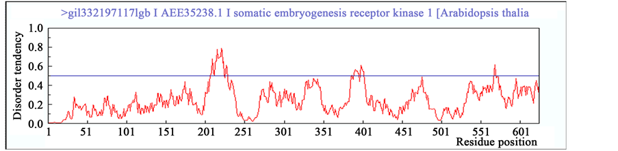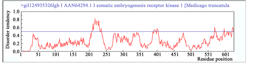 Figure 5. Prediction of intrinsic disordered regions in SERK and SERK-like genes. (A) SERK protein sequence of Arabidopsis SERK1 (AtSERK1) reported earlier for its direct role in SE; (B) SERK protein sequence of Medicago SERK1 (MtSERK1) reported earlier for its direct role in SE; (C) SERK protein sequence of Arabidopsis SERK4 (AtSERK4) known for having no role in SE. Any incisive peak touching or crossing the threshold (0.5) disorder tendency was considered to be significant disordered region.