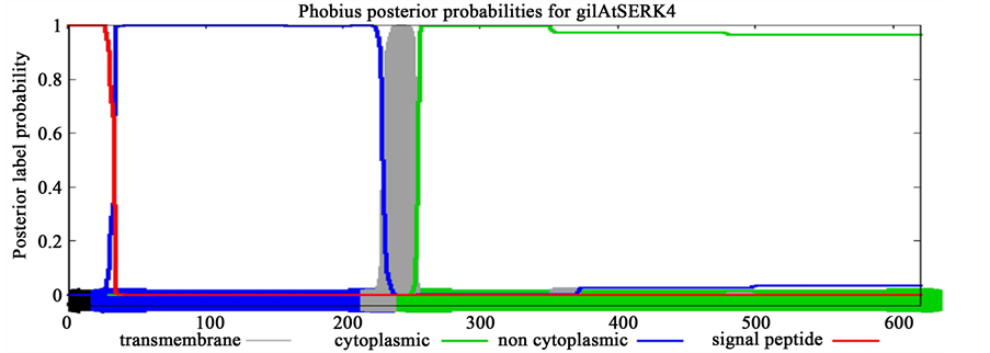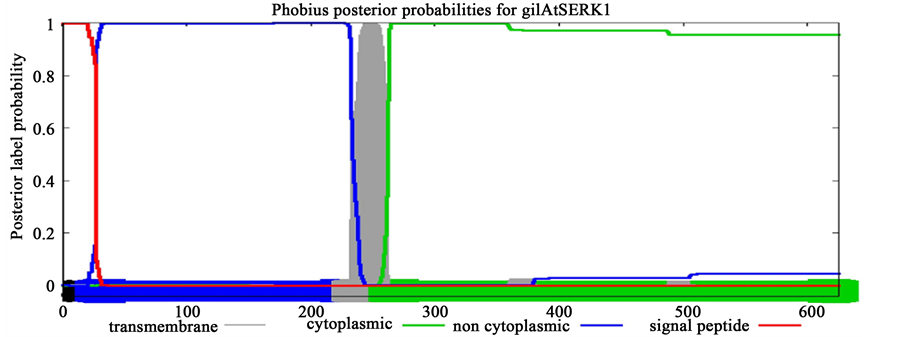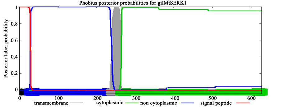 Phobius online platform (http://phobius.sbc.su.se/) was used for transmembrane topology and signal peptide analysis in the AtSERK1 (AEE35238.1), AtSERK4 (AEC06259) and MtSERK1 (AAN64294.1). The protein sequences in FASTA format for each were obtained from NCBI protein database as already mentioned above and directly submitted to the Phobius online platform (http://phobius.sbc.su.se/). The prediction is based on a Hidden Markov Model (HMM) and algorithm called N-best performing the different sequence regions of a sig- nal peptide and the different regions of a transmembrane protein in a series of interconnected states [40] . It re- duces the chance of false classifications of transmembrane helices and signal peptides. In comparison to TMHMM and SignalP programmes [40] where often signal peptides are predicted as TM helices by mistake.