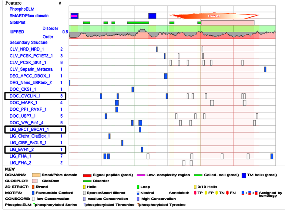 Figure 1. SLiMs of a typical SERK sequence from MtSERK1. Three significantly different linear motifs remain present exclusively in the SERK proteins viz. DOC_CYCLIN_1; LIG_BRCT_BRCA1_1 and LIG_EVH1_2, as highlighted with the box.