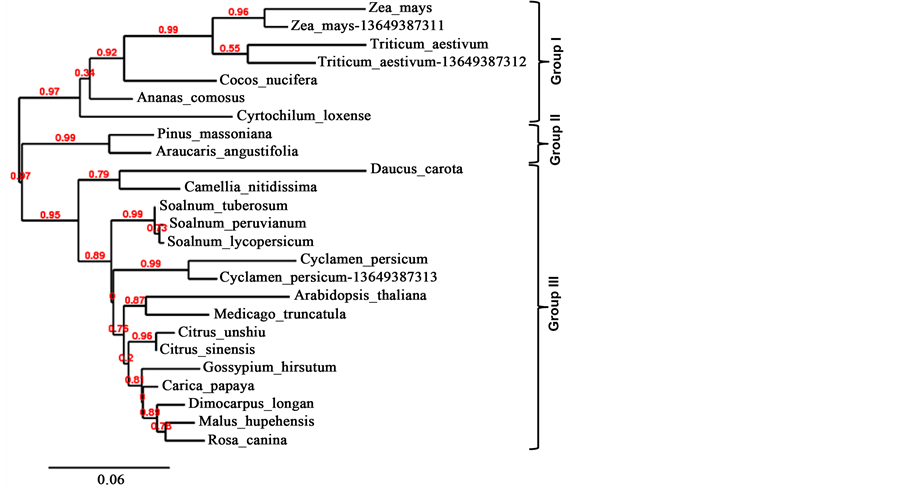 In Group I of monocots, SERK and SERK-like genes of maize and wheat showed close relationship than co- conut and Ananas, and clustered into a single group with an average of 69% identity. The cluster includes both SERK and SERK-like protein sequences and has been reported to be involved in SE and other roles of the SERK proteins, alone or in combination with other members. Group II is constituted with two conifers Pinus and Araucaria aligned together with high amino acid similarity. However, all studied eudicots constructed group III harboring different species of Solanum, Cyclamen and Citrus spp. along with other taxa (Figure 3). Three