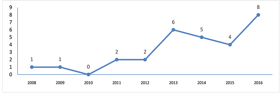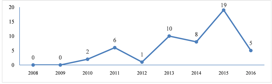 Figure 1. The publishment number of WO papers in CNKI from 2008 to 2016.