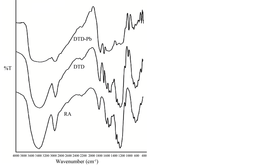 Figure 2. FT-IR spectra of native cellulose (RA), chemically mo- dified cellulose (DTD) and Pb2+ metal ion adsorbed modified cellulose DTD-Pb.