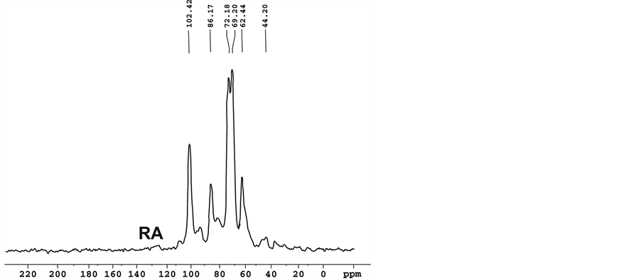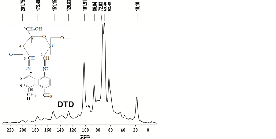 hence the C-C ring stretching frequency is not observed in the modified cellulose. A new peak at 1624 cm−1 is clearely due to the -N=CH- stretching frequency and the C-N stretching frequency appeared at 1517 cm−1 which supports the formation of methyl benzalaniline pendent groups in the chemically modified cellulose. To further establish the structure of chemically modified cellulose, solid state 13C-NMR spectroscopy was performed on both native and modified cellulose. 13C CP-MAS NMR spectra of natural cellulose and DTD are given in Figure 3 and Figure 4, respectively. In natural cellulose the C1-C6 signals appeared between δ values of 62.4 - 102.4 ppm. However, chemically modified cellulose DTD clearly showed the presence of pendent methyl benzalaniline groups in the cellulose chain (Figure 4). Apart from the usual signals, broad signals at 201.7 ppm are due to the azomethine carbon C7. Aromatic carbons C8 appeared at 175.9 ppm, C9 and C10 showed signal at 126.8 ppm and 151.1 ppm respectively. The C11 of CH3 groups appeared at 18.1 ppm.