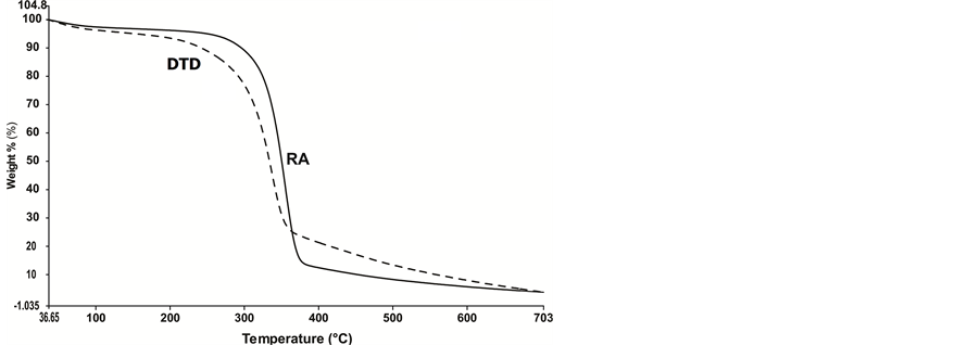 TG traces of cellulose and DTD are shown in Figure 5. It is clear from the figure that natural cellulose has better thermal stability than chemically modified cellulose DTD. Initial decomposition temperatures of natural cellulose and DTD occur around 270˚C and 150˚C respectively. This indicates that DTD can be used as an adsorbent up to 150˚C. The decrease in thermal stability of DTD is probably due to the breaking up of pyranose ring at C2 and C3.