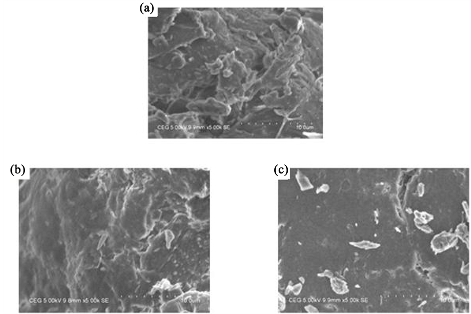 Figure 6. Scanning electron micrographs of (a) DTD, (b) Pb2+ loaded DTD and (c) Cu2+ adsorbed DTD.