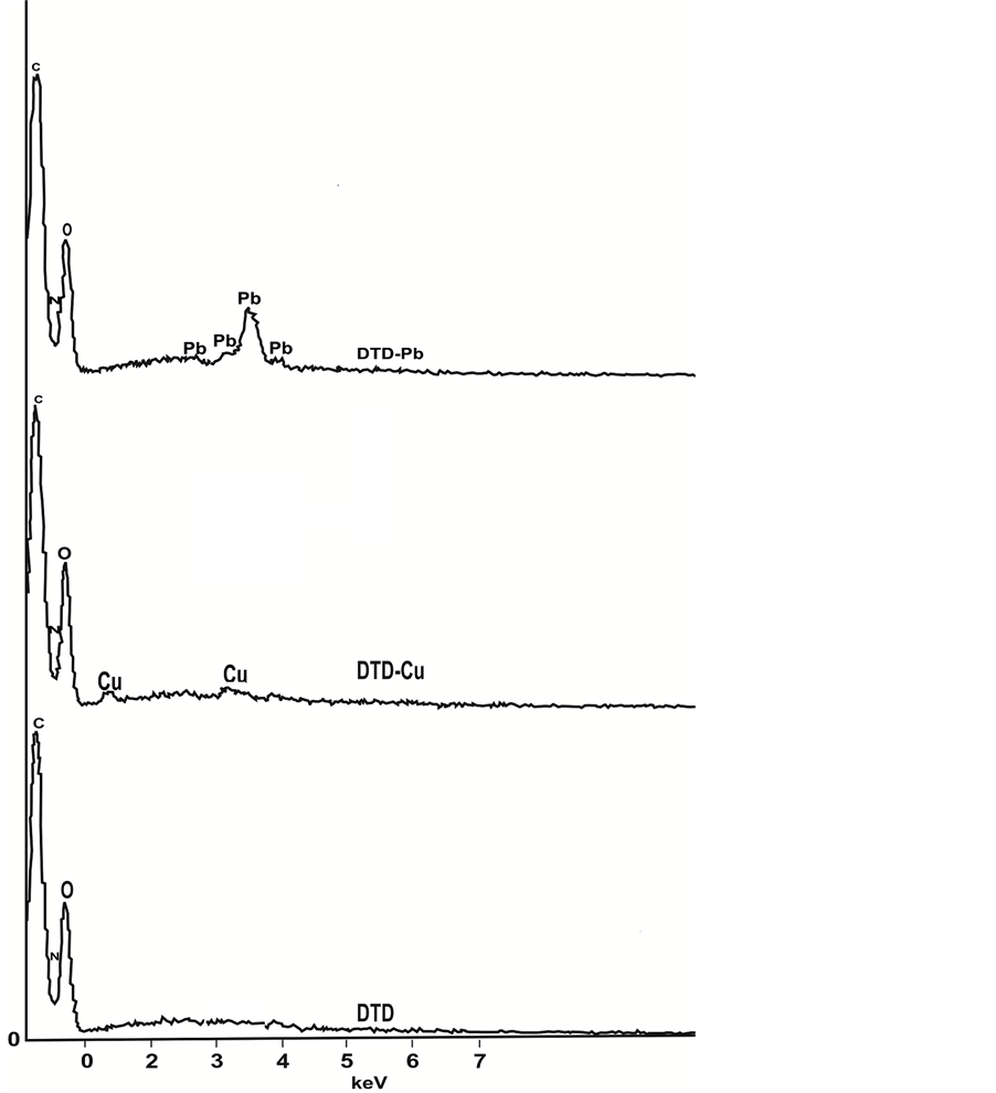 Figure 7 present the EDX spectra of DTD, Cu2+ treated DTD and Pb2+ treated DTD respectively. It is obvious that the DTD spectrum (Figure 7(DTD)) showed only carbon, oxygen and nitrogen peaks. However, Cu2+ and Pb2+ metal ion solution treated DTD (Figure 7(DTD-Cu) & Figure 7(DTD-Pb)) showed in addition to C, O and N clear peaks for Cu and Pb, thus confirming the metal ion uptake ability of DTD from aquous solutions.