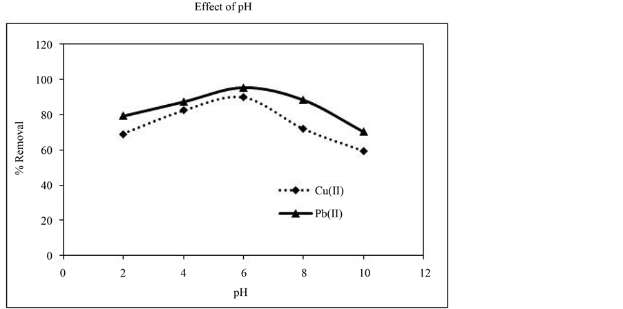 The pH of the solution affects the adsorptive process through protonation and deprotonation of functional groups of the active sites of the adsorbent surface. Initial pH values were varied from 2 - 10 and the corresponding % adsorption is given in Figure 8. The adsorption capacity increases with increasing pH values up to 6 and decreases beyond this value. The present removal of metal ions exhibited a significant increase at pH 6 is attributed to the low H+ concentration which may compete with metal ions for coordination with active azomethine groups and subsequently lower the percent removal at low pH values. However at a lower pH value of 2 the percent removal of metal ions is >70% which suggests that the adsorbent is an effective one even at lower pH values which is an important requirement in the industrial applications.