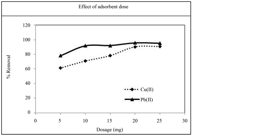 Adsorbent dose was varied from 5 mg - 25 mg and the percent removal is shown in Figure 9. As the adsorbent dose increases the percent removal of metal ion increases and reaches a saturated value at the dosage of 20 mg. With increase in the adsorbent dose, the active sites available for coordination with metal ion increases and hence the percent removal increases. At 20 mg dosage maximum metal ions are removed and any further increase beyond this value, the percent removal remains constant. One of the interesting aspects of this study is that even at a low dosage of the adsorbent (10 mg) the percent removal is >70% suggesting the high concentra-