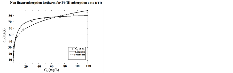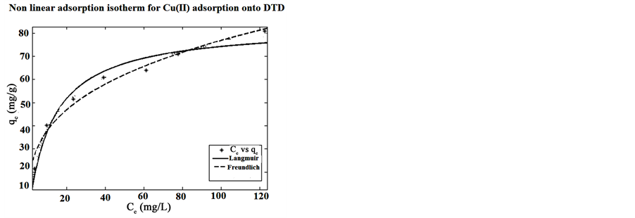 The initial concentration of metal ions is an important factor for effective adsorption. The percentage removal of metal ions Cu(II), Pb(II) at different metal ion concentration (10 - 30 mg/L) were performed by keeping all other parameters constant. An adsorption isotherm can be used to characterize interaction of the adsorbates with adsorbents and optimizing the use of adsorbents. Adsorption isotherms are the basic requirements for designing any adsorption system. The distribution of metal ions between the liquid phase and the adsorbent is a measure of the position of equilibrium in the adsorption process and can be expressed by a series of isotherm models. The non-linear forms of the Langmuir [21] and Freundlich [22] adsorption isotherm models were used to evaluate the adsorption experimental data, using MATLAB R2009a. The non-linear forms of the Langmuir and Freun-