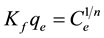 where Ce―the equilibrium concentration of the metal ions in the solution (mg/L), qe―the adsorbed value of the metal ion at equilibrium concentration (mg/g),