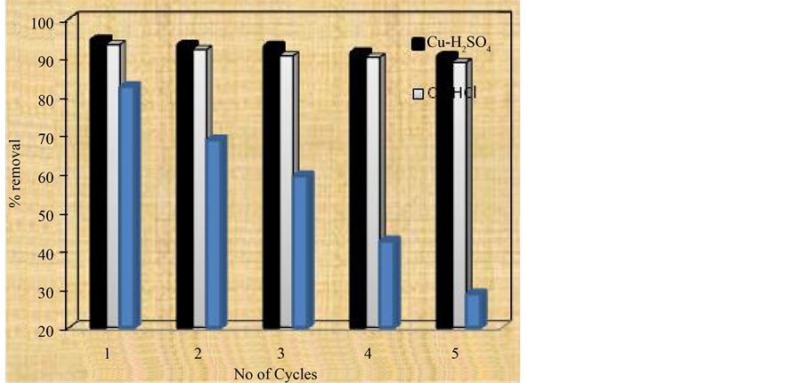 The acid solutions of 0.1 M of H2SO4, HCl and CH3COOH were used as eluents. On comparison 0.1 M solutions of H2SO4 and HCl has equal efficiency for the regeneration of Cu(II) and Pb(II) metal ions than 0.1 M solution of CH3COOH. This is due to the weak acidic nature of CH3COOH. Even after five cycles of adsorption- desorption, the efficiency of DTD did not exhibit a significant decrease. The polymeric resins with azomethine group are acid resistant and the adsorbents had a good potential for reuse. The results shows adsorption-desorp- tion process is a reversible process which specifies the formation of coordinate bond between the chelating groups and the metals.