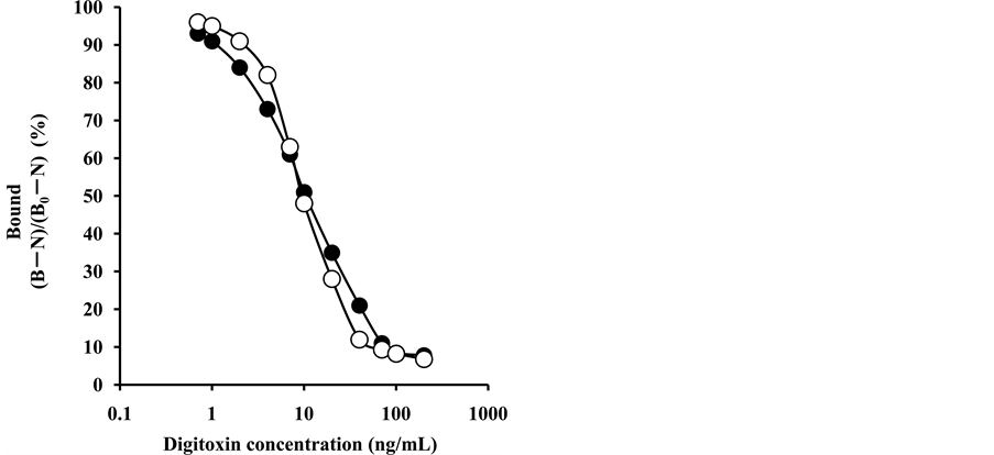 The specificities of Antiserum-A and Antiserum-B were assessed by means of cross-reaction assays with various related compounds. The percentage cross-reactivity was calculated at 50% displacement of the antibody-bound labeled digitoxin, and the results are listed in Table 1. Antiserum-A showed high specificity for digitoxin, exhibiting low cross-reactivity with dihydrodigitoxin (19.3%), digoxin (6.19%), digoxigenin bisdigitoxoside (2.05%), digitoxigenin bisdigitoxoside (1.95%), and dihydrodigoxin (1.33%). Further, there was little cross-reactivity with digoxigenin monodigitoxoside (0.70%) or digitoxigenin monodigitoxoside (0.14%). In contrast, Antiserum-B exhibited considerable cross-reactivity with digitoxigenin (162%), digitoxigenin bisdigitoxoside (129%), digitoxigenin monodigitoxoside (54.2%), and digoxigenin bisdigitoxoside (29.3%), although it showed low cross-reactivity with digoxin (7.98%), dihydrodigoxin (6.68%), digoxigenin (5.11%), and digoxigenin monodigitoxoside (1.99%), and had no significant cross-reactivity with dihydrodigoxin (0.09%). Other
