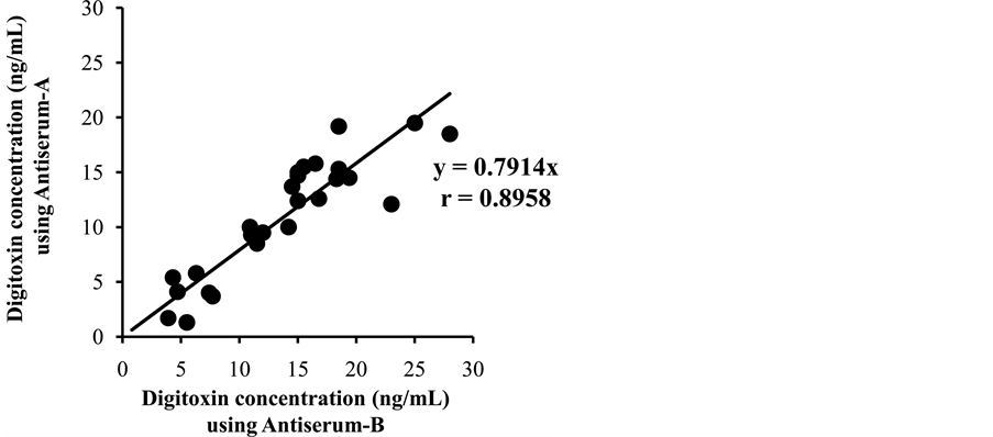 It is well known that digitoxin is metabolized to the bisdigitoxoside, monodigitoxoside, and genin by cleavage of sugar moieties [6] . In addition, digitoxin is metabolized to digoxin and its degradation products by C-12 hydroxylation and to dihydrodigitoxin by reduction of the double bond in the lactone ring [7] [8] . As shown in Table 3, we investigated whether digitoxin metabolites interfered with the assay in human serum. Each metabolite was added to human serum at a ratio of 10% to digitoxin, and a recovery test was performed. The recovery ratios using Antiserum-A at 5, 10, and 20 ng/mL were within the range of 109.0% - 112.4%. In contrast, those using Antiserum-B at 5, 10, and 20 ng/mL were within the range of 176.0% - 183.6%. These results indicate that the interference by digitoxin metabolites was significant in the case of Antiserum-B, but was greatly reduced with Antiserum-A.
