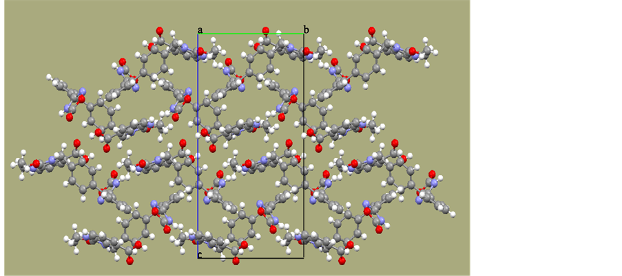 In the crystal, the main molecular interaction is hydrogen bonding interaction. As seen in Table 4, the distance between H1… N4 is longer than that of H4…O3, indicating a stronger hydrogen bond in O4−H4…O3. The bond O4−H4… O3 is almost linear, ideal for hydrogen bond formation [8] the strength of this hydrogen bond is also reflected in the short O3… O4 distance (the reported range is 3.2 - 4.0 Å) [9] . The C18−H18… O1 intermolecular hydrogen bond is weaker, with the hydrogen much closer to the donor atom (C18).