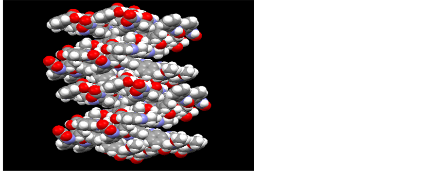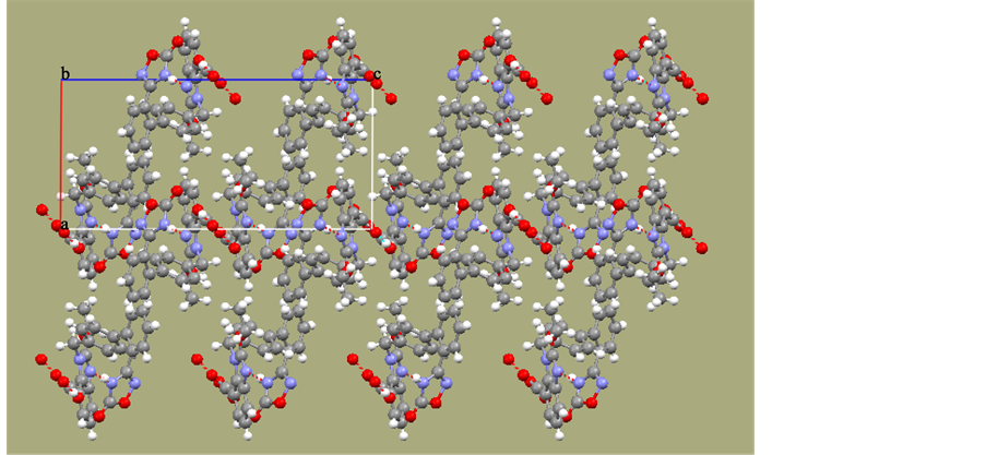 The crystal lattice-packing graph along axis b and c are shown in Figure 5 and Figure 6, respectively, whereas the space-filling model is depicted in Figure 7. There are π-π stacking interactions between the imidazole rings of neighboring cells. The distance between the centers of the rings is 5.557 Å and the vertical distance between the two rings is 3.507 Å.