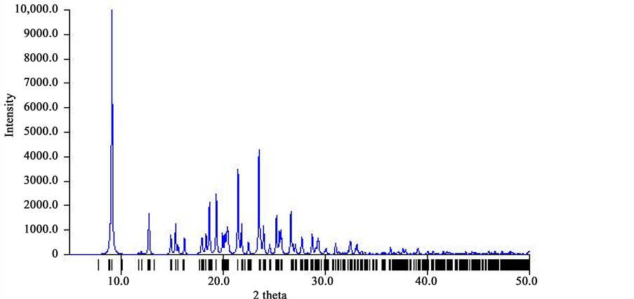 The simulated and observed powder diffraction graphs of Azilsartan type I crystal were shown in Figure 8 and Figure 9, respectively. Peaks were observed at 2q values of 9.01˚, 12.91˚, 15.52˚, 18.38˚, 19.43˚, 21.50˚, 23.58˚, and 26.72˚, in good agreement with the simulated values. These values are also consistent with the reported val-