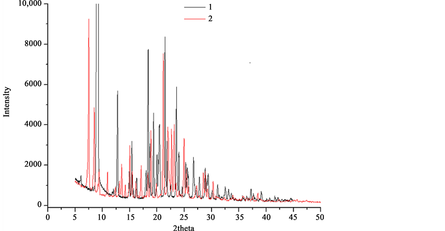 Figure 9. Overlaid powder diffraction graph of Azilsartan crystals (1 is type I, 2 is type II).