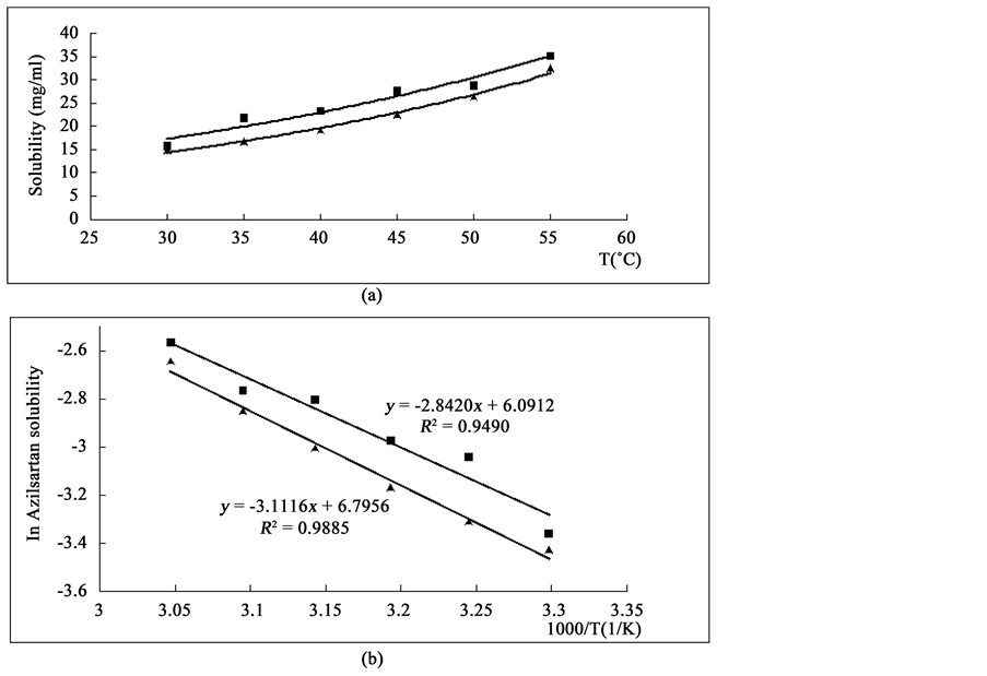 The thermostability of different crystals can be inferred from their solubility in the same solvent. The solubility data in methanol are shown in Figure 10(a). In the temperature range of 30˚C - 55˚C, the solubility of type I crystal is always lower than that of type II crystal and phase transformation is not observed. The solubility data and the melting point data both suggest that type I crystal is more stable than type II.