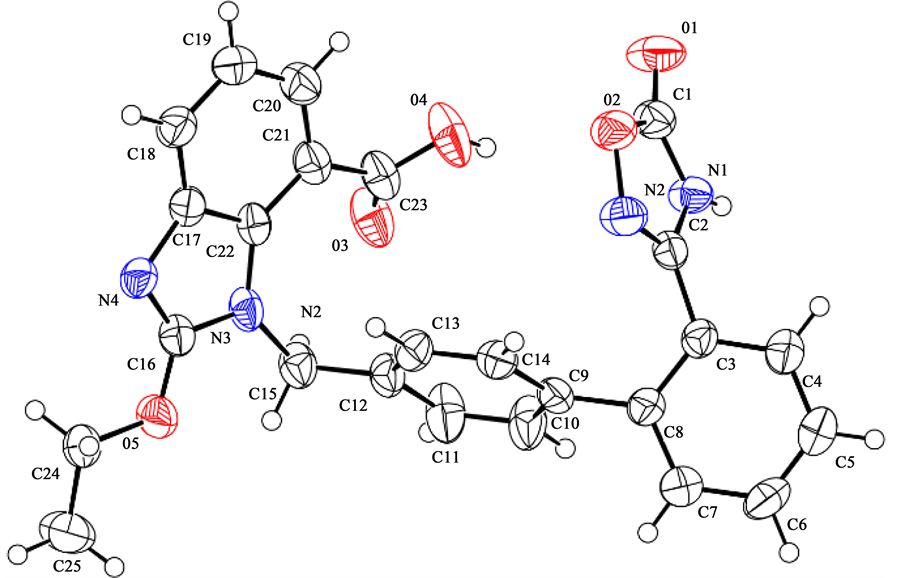 Figure 3 is ORTEP Drawing of Azilsartan Type I Crystal (prob = 50) and Figure 4 is Ball-and-Stick Illustration of the Structure of Azilsartan Type I Crystal. The values of selected bond length, bond angle, dihedral angle, and torsional angle in Azilsartan type I crystal are summarized in Table 2 and Table 3. In the oxadiazole moiety, the torsional angles for C1-N1-C2-N2 and N1-C1-O2-N2 are −0.8(4) and −1.5(4)˚, respectively, indicating that the ring is almost planar. The torsional angle for N1-C2-C3-C4 is 68.9(5)˚, suggesting that the oxadiazole ring and the benzene ring are not exactly perpendicular to each other. The two benzene rings are also not perpendicular to each other, with the torsional angle for C3-C8-C9-C10 being 118.3(4)˚. The dihedral angles between ring I [O(2)N(2)C(2)N(1)C(1)] and ring III [C(3)C(4)C(5)C(6)C(7)C(8)] and between ring III and ring IV [C(9)C(10)C(11)C(12)C(13)C(14)] are 71.9(2) and 60.04(19)˚, respectively, indicating a lack of coplanarity for these rings. On the other hand, ring II [N(3)C(16)N(4)C(17)C(22)] and ring V [C(17)C(18)C(19)C(20)C(21)C(22)] are almost coplanar, with a dihedral angle of 2.33(19)˚. The carboxylic acid group on C21 has a torsional angle of 37.4(6)˚ (C22-C21-C23-O3).