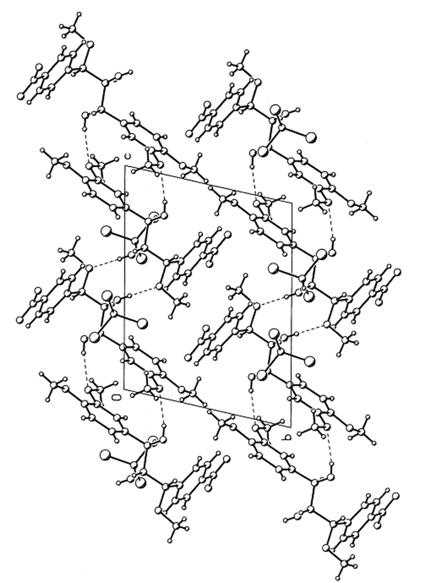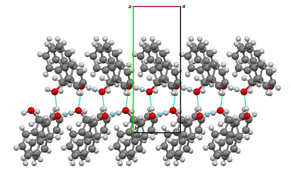 The crystal packing in both structures 1 and 2 are dominated by O-H・・・O hydrogen bonding interactions, with donor-acceptor distances of 2.705 (2) and 2.765 (2) Å; 2.958 (3) and 2.730 (2) Å. In structure 1, these hydrogen bond interactions generate (9) ring motifs [15] . In molecule 1, each molecule is connected to two of its neighbors via intermolecular hydrogen bonds; the packing is viewed down the c-axis (Figure 2). The structure is further linked by C-H・・・π stacking interactions.