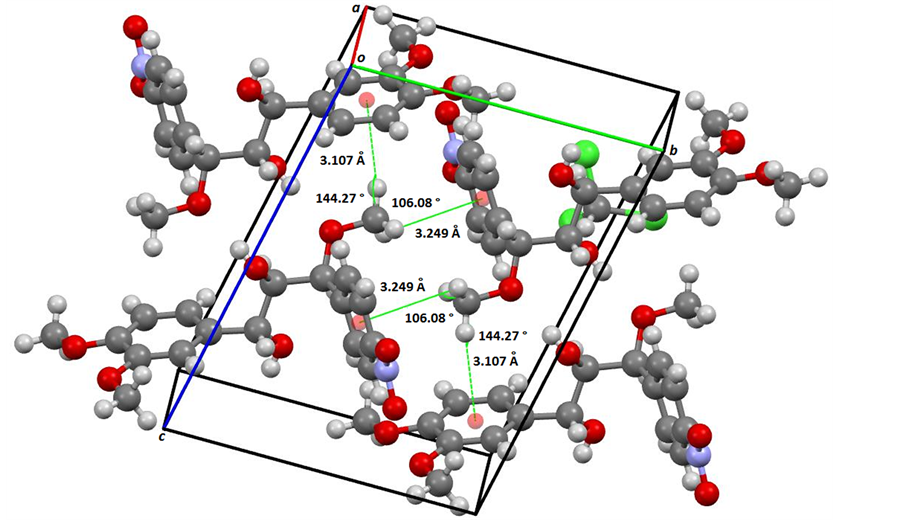In structure 2, the distances between the Cg gravity centers of phenyl C4-C9 rings; phenyl rings C4-C9 and C12-C17; phenyl ring C4-C9 and H18B of the methoxy group at C3; and phenyl ring C12-C17 and H18C of the