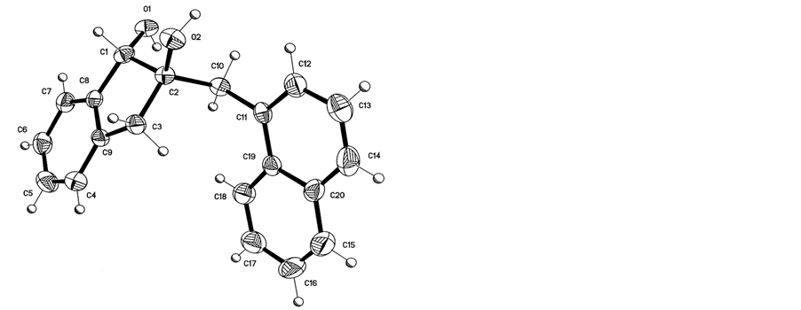 In a 100 mL of a round-bottom flask, 0.5 mmol of recrystallized 3'-(naphthalen-2-yl)spiro[indene-2,2'-oxi- ran]-1(3H)-one was suspended in 50 mL of distilled ethyl ether at 0˚C with magnetic stirring. Then, 2 mmol of LiAlH4 suspended in 10 mL of ether were added and the mixture was allowed to react for 3 h, followed by SiO2 TLC. After acidification with 10% HCl, the extraction and evaporation of the organic solvent, a crystalline solid mp = 176˚C was obtained which was recrystallized from ethyl acetate: Hexane and 86% yield. 1H NMR (300 MHz CDCl3 -DMSO): δ 2.54 (d,1H, J 15.6Hz,CH2) 3.01 (d,1H,J 15.9Hz, CH2), 3.29 (d, 1H,J 14.4 CH2), 3.45 (d, 1H, J 14.4 CH2), 4.22 (s, 2H, C-OH), 5.0 (s, 1H, C-H), 7.08 - 7.22 (m, 2H, CarylH), 7.22 - 7.42 (m, 2H, CarylH), 7.42 - 7.53 (m, 4H, CarylH), 7.72 - 7.81 (m, 2H, CarylH), 8.03 (d, 1H, J 6.6 Hz, CarylH), 13CNMR (13C{1H} 75.5 MHz, CDCl3-DMSO): δ 34.5 (C-H), 40.9 (C-H), 82.5 ( (C-H), (C-OH)), 84.5 (C-OH), 124.1 (CarylH), 124.3 (CarylH), 124.6 (CarylH), 124.7 (CarylH), 124.7 (CarylH), 124.8 (CarylH), 126.0, (CarylH), 126.0 (CarylH), 127.3 (CarylH), 127.8 (CarylH), 128.5 (CarylH), 132.2 (Caryl), 133.1 (Caryl), 133.2 (Caryl), 140.1 (Caryl), 143.9 (Caryl), IR (1122.86 cm−1 , 1596.43 cm−1, 1927.62 cm−1, 2873.83 cm−1, 3058.53 cm−1, 3283.09 cm−1), EM: M+ 290 (calc. exact mass 290.36) (Scheme 1).