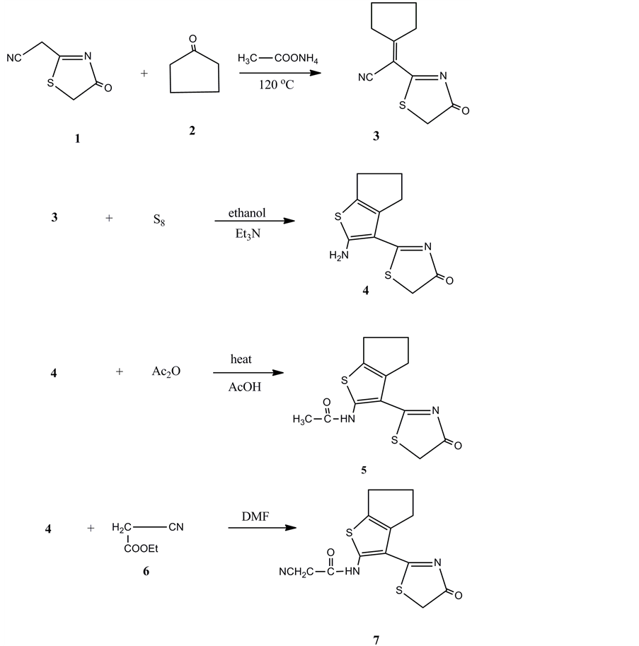 Although the number of drugs is available in the market, the need of discovering the new anti-tumor drugs with better pharmacokinetic profile and lesser toxicity has become the main objective in the field of medicinal chemistry, and it is also due to the fast microbial resistance to the existing molecules [1] - [3] . A large number of compounds containing thiophene system have been investigated because of their broad spectrum of biological activities which include analgesic [4] , antibacterial [5] , antifungal [6] , antiparasitic [7] , antiviral [8] , anti-inflam- matory [9] , anticonvulsant [10] , anti-nociceptive [11] , DNA cleavage [12] , herbicidal [13] , antitubercular [14] , protein kinase inhibition [15] , respiratory syndrome protease inactivation [16] , an active ester in the peptide synthesis and agonists of peroxisome proliferator activated receptors [17] . In the present work, we study the reactivity of compound 3 resulting from reaction of the 2-(4-oxo-4,4-dihydrothiazol-2-yl)acetonitrile (1) with cyclopentanone to produce novel thiophene derivatives together with cytotoxic evaluations of the newly synthesized products towards different cell lines.