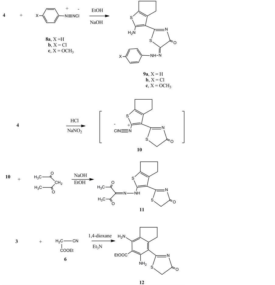 The high yield of compound 4 encouraged us to study its further reactivity towards some chemical reagents. Thus, the reaction of 4 with any of benzene diazoniumchloride 8a, 4-chlorobenzene-diazonium chloride 8b or 4-methoxybenzene-diazonium chloride 8c in the presence of ethanol and sodiumhydroxide gave the arylhydrazonederivatives 9a-c, respectively. The analytical and spectral data of the latter products are consistent with their respective structures. On the other hand, compound 4 is capable for diazotization and coupling. Thus, compound 4 reacted with sodium nitrite in the presence of sodium nitrite and acetic acid at 0˚C - 5˚C gave the non isolablediazonium salt 10. The latter coupled with acetylacetone to give the hydrazoderivative 11.