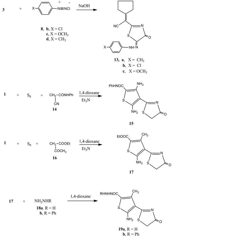 Moreover, compound 3 was coupled with any of 4-chlorobenzenediazonium chloride 8b, 4-methoxybenzene- diazonium chloride 8c or 4-methyl benzene diazonium chloride 8d in the presence of ethanol and sodium hydroxide gave the arylhydrazone derivatives 13a-c, respectively. Compound 1 reacted with elemental sulphur and cyanoacetanilide (14) in 1,4-dioxane and the presence of triethylamine to give the ethyl 3,5-diamino-4- (4-oxo-4,5- dihydrothiazol-2-yl)thiophene-2-carboxylate 15.