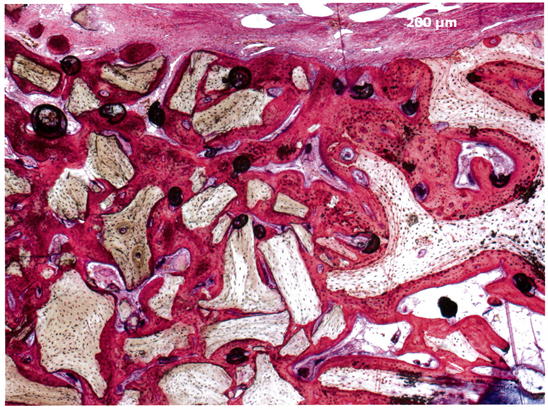 Figure 5. Histological section showing bone repair after 6 weeks’ implantation with deproteinized, porous xenograft granules (Orthoss®) in rabbit femoral condyle model. Presented with permission of Prof. Gordon Blunn, Institute of Orthopedics and Musculoskeletal-Science, University College London.