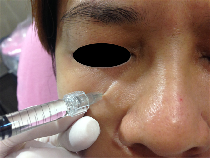 Figure 3. Single point deep injection of HA filler on treatment area using sharp needle on case 5.