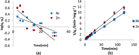 Figure 5. Kinetic adsorption parameters of the (a) Pseudo-first-order model and (b) Pseudo-second-order model of Zn2+ and Ni2+ (400 ppm) onto CH (0.5 g) at 25˚C.