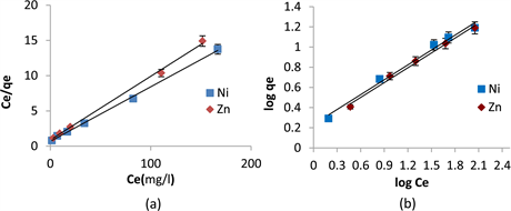 Figure 6. (a) Langmuir and (b) Freundlich sorption isotherms linear regression analysis of Zn2+ and Ni2+ adsorption onto CH.