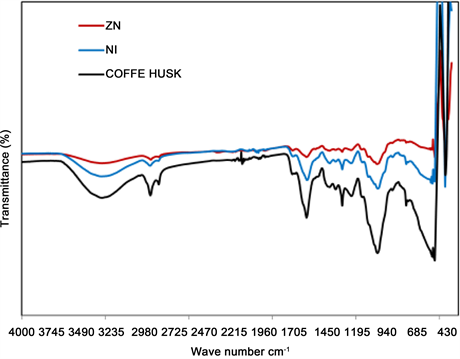 FTIR spectra of coffee husk before and after adsorption of Zn2+ and Ni2+ ions are demonstrated in Figure 3. The observed peaks in the range 3526.07 - 3000 cm−1 suggested the existence of the hydroxyl and amide -NH groups whereas the peaks at 2917.9 and 1720 cm−1 are assigned to C-H of alkyl and C=O groups, respectively. The peaks at 1639.7, 1233.8, 1023.4 cm−1 were also attributed to -C=C- of the aromatic ring, peak (C-O), (OH) of the carboxy groups and alcohols