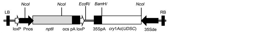 Figure 1. A vector map of the construct used for developing transgenics in tobacco and cotton, used by Rawat et al. 2011. The construct carries the cry1Ac (UDSC) gene driven by a CaMV 35S double enhancer promoter at the right border, and a selection marker nptII gene driven by the nos promoter at the left border.
