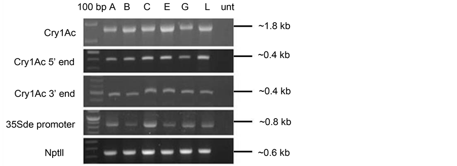 Six T1 progeny of the non-expressor line 1.35 were analysed for the presence or absence of the transgene cassette by PCR. Primers designed from different regions of the cry1Ac (i.e promoter, 5’ and 3’ halves of the cry1Ac gene) and nptII gene cassettes (Table 1) were used to study the structural integrity of the transgenes. It was observed that all the cassettes were present and there was no aberration in the integrated cassette (Figure 3). This observation was different from a previous observation made in cotton [6] , were a large number of transgenics were observed not to carry the cry1Ac gene while retaining